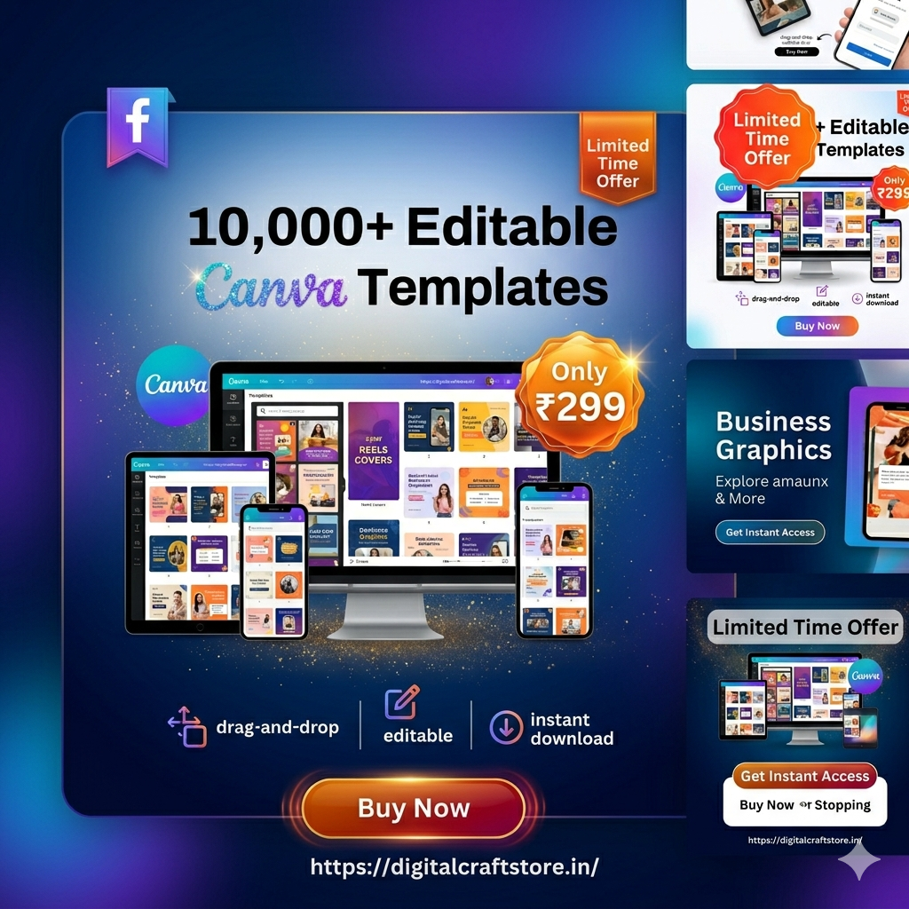 You get a massive collection of editable templates including social media posts, reels, flyers, business cards, posters, ebooks, planners, thumbnails, logos, ads, and much more — all fully customizable inside Canva.